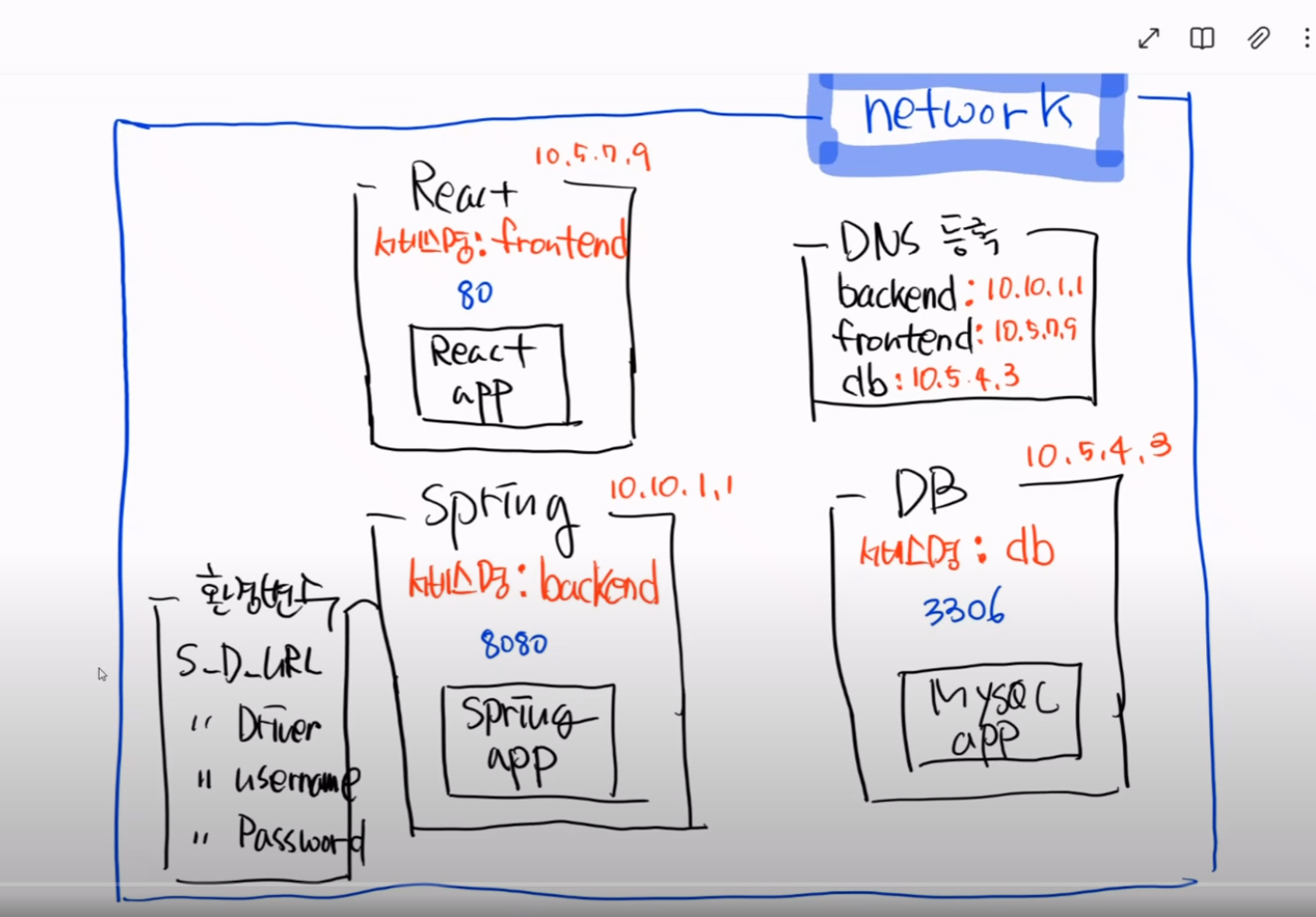 환경변수는 말그대로 변수이므로 S_D_URL = 10.10.1.1로 들어가면 그것을 Spring이 참조하게 된다. 그 과정에서 DNS 레지스트리가 필요한 거라고 하심.