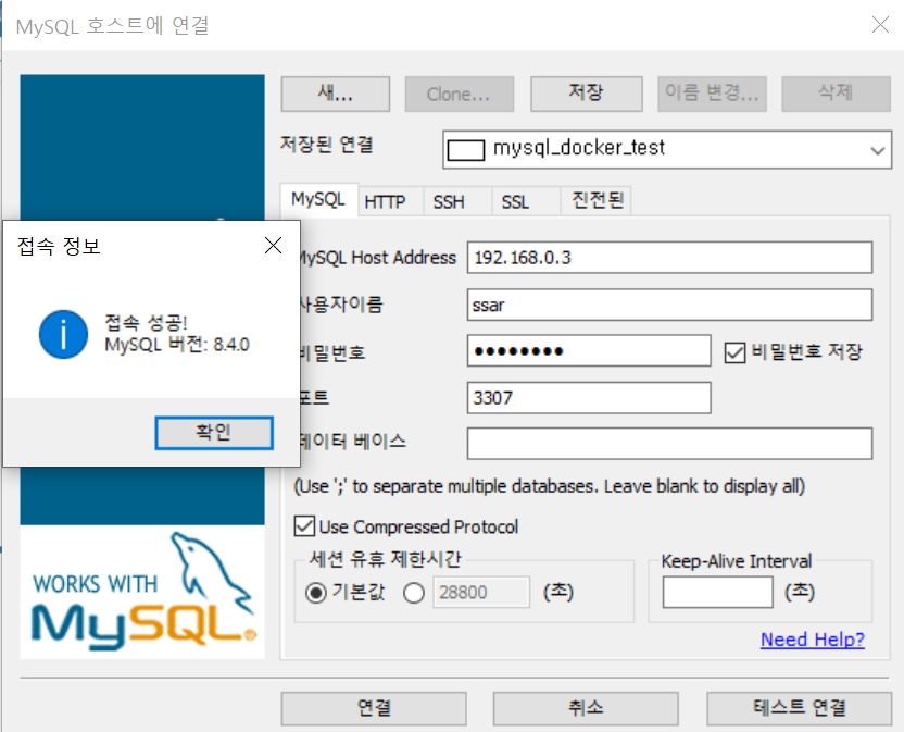 IP와 Dockerfile에서 설정한 MYSQL_USER, MYSQL_PASSWORD에 입력한 부분을 입력하고 포트로 3307(3306으로 포워딩)을 입력 후 테스트 연결에 성공하면 끝!