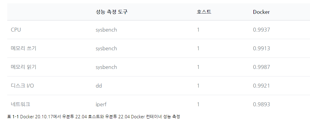 가상화와 달리 도커는 게스트 OS를 설치하지 않고 OS자원은 호스트와 공유하는 방식이다. 이미지 용량이 크게 줄어들었으며 HW 가상화 계층이 없기 때문에 메모리 접근, 파일시스템, 네트워크 속도가 가상 머신에 비해 월등히 빠르다.