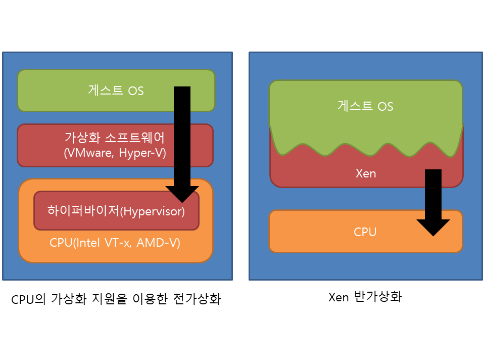 전가상화의 성능 개선을 위해 개발된 반가상화가 널리 쓰이고 있다.