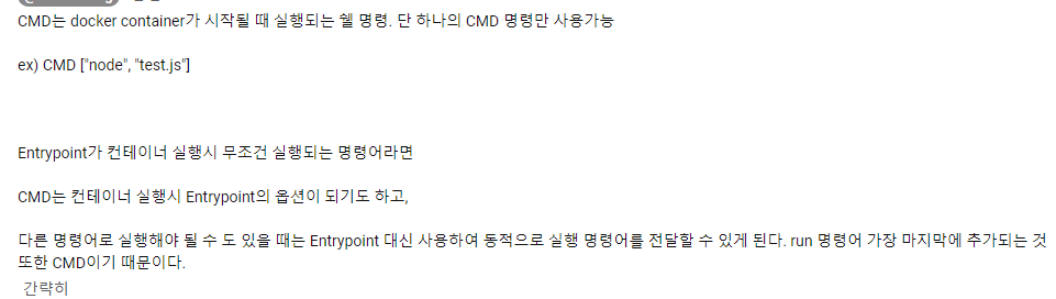 정리하자면 무조건 대체제없이 실행되어야할 것들은 ENTRYPOINT로 실행하면될거같고, 내가 run할 때마다 바꿀수도있는 값은 CMD로 설정해두면 될거같다.