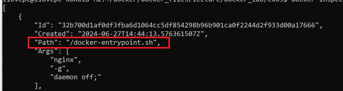 좀 더 자세히 보기 위해서 docker inspect를 사용해서 봐보자. 컨테이너 내부에서 해당 shell 파일을 실행시켜 주는 것 같다.
