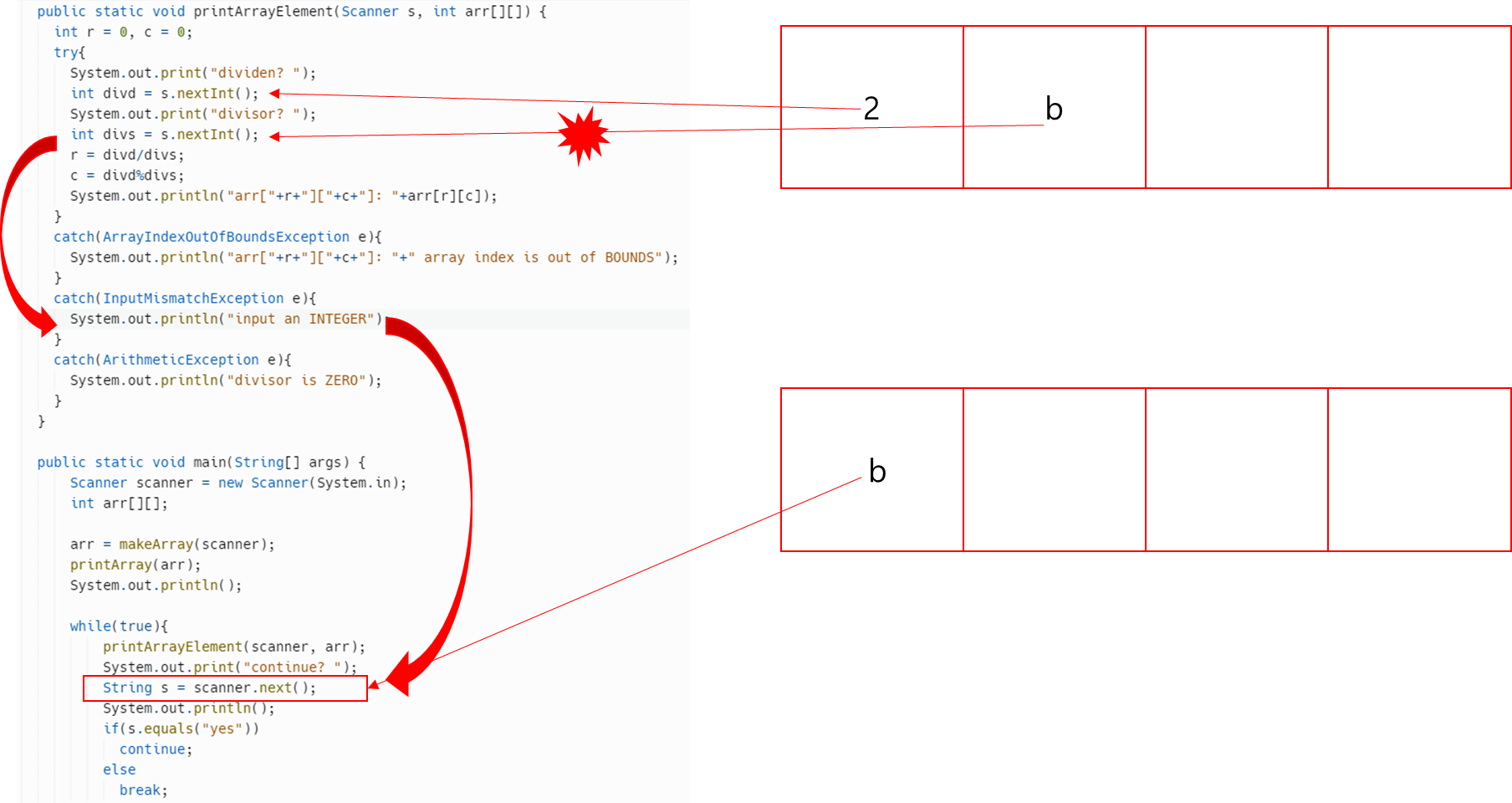 - int divs = s.nextInt() 코드에서는 b를 int로 읽을 수 없기 때문에 에러가 발생하여 catch문으로 빠지게 된다.