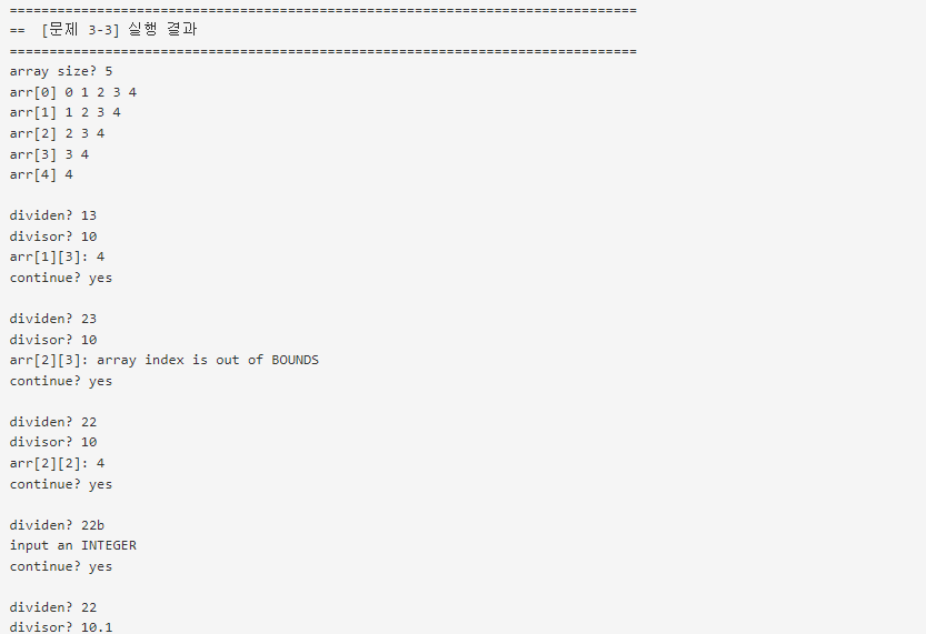 ③ catch문은 선언한 순서대로 실행된다. 즉, 에러가 ArrayIndexOutOfBoundException인지 검사하고 아니라면 InputMismatchException으로 넘어간다.