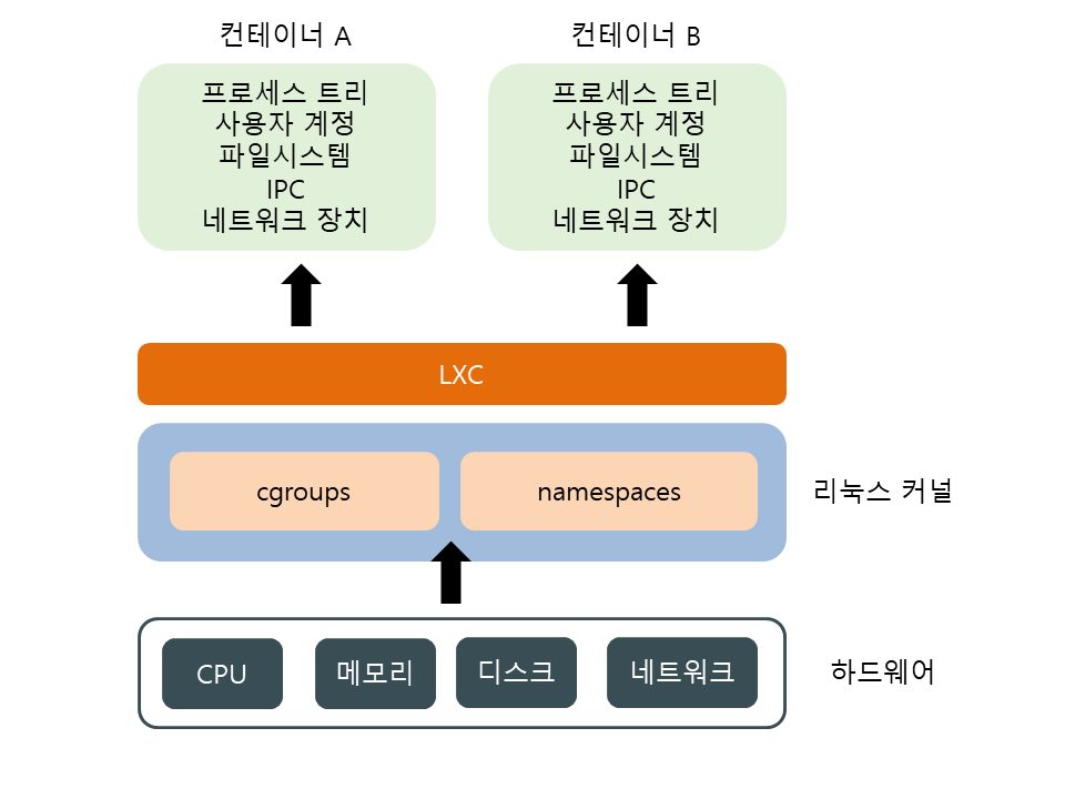 LXC는 리눅스 커널의 cgroups와 namespaces기능을 활영하여 가상 공간을 제공한다.