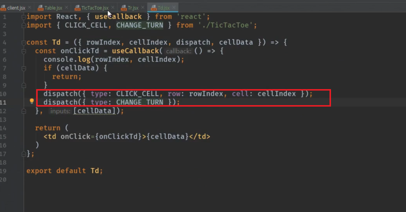 강의에서는 테이블 클릭 이벤트 ▶ CLICK_CELL 액션 생성 ▶ dispatch 호출 ▶ reducer 호출 ▶tableData, recentCell state변경 ▶ useEffect에서 변경된 tableData를 기반으로 승리자가 있는지 검사 할 때 사용했다.