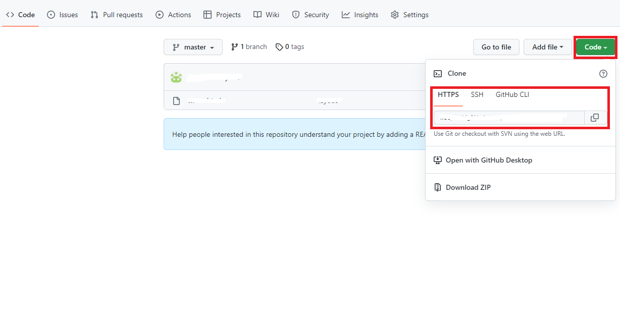 생성된 원격저장소 화면에 들어가서 우측 상단 Code 부분을 클릭하면 원격저장소의 주소가 나온다.